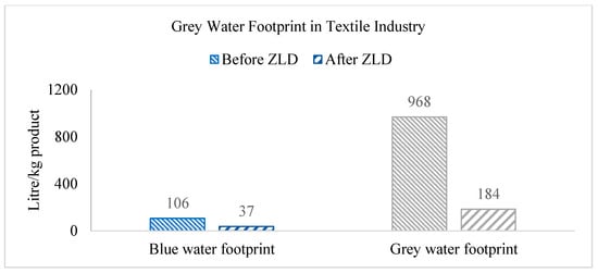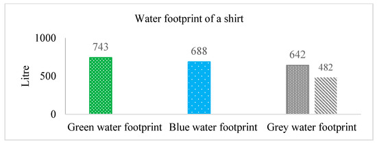 Water footprint of a shirt was estimated at 2194 L, considering weight of one shirt is 150 g [48]. Among the total water footprint, green, blue and grey water footprints were found to be 743 L, 696 L and 642 L, respectively (Figure 13). This calculation was made without considering ETP and STP. If ETP and STP are considered, the grey water footprint for one shirt is reduced to 482 L.