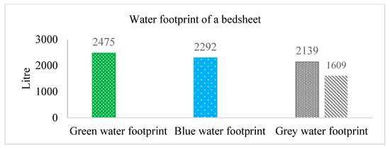 Water footprint of a single bedsheet was estimated to be 7312 L, considering the weight of a single bedsheet is 500 g [49]. Among the total water footprint, green, blue and grey water footprints were found to be 2475 L, 2292 L and 2139 L, respectively (Figure 14). This calculation was made without considering ETP and STP. If ETP and STP are considered, the grey water footprint for a single bedsheet is reduced to 1609 L.