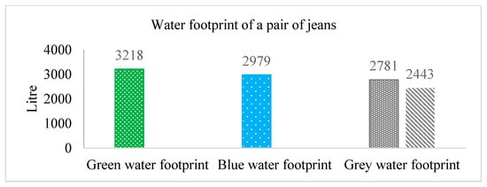 Water footprint of a pair of jeans was estimated to be 9506 L, considering the weight of a pair of jeans is 650 g [48]. Among the total water footprint, green, blue and grey water footprints were found to be 3218 L, 2979 L and 2781 L, respectively (Figure 15). This calculation was made without considering ETP and STP. If ETP and STP are considered, grey water footprint for a pair of jeans is reduced to 2443 L.