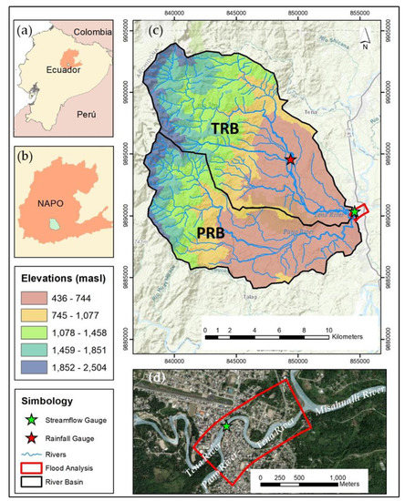 General features of the study area. (a) Location of the Napo province in Ecuador; (b) study area within the Napo province; (c) terrain elevation and location of the precipitation and streamflow gauges; (d) domain used for flood hazard assessment (red polygon) in the city of Tena.