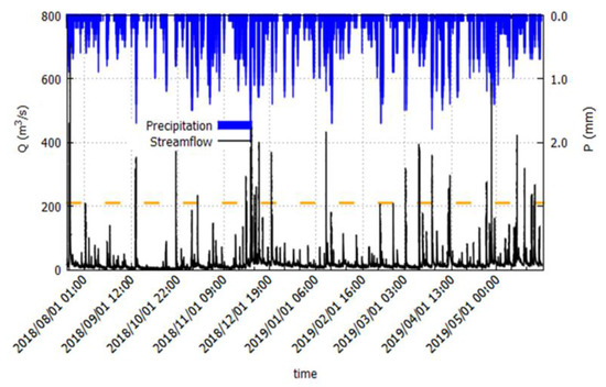 Time series of precipitation (P) and streamflow (Q) from July 2018 to May 2019. The orange dashed line represents the 211 m3/s threshold for storm event selection.