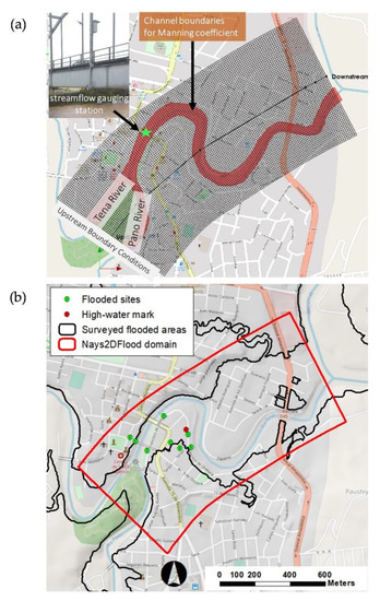 Hydrodynamic domain and control points for calibration and validation. (a) Modeling domain for the hydrodynamic simulations and location of the streamflow gauging station; (b) Polygon of flooded areas (black line), additional control points of flooded sites (greenish dots), and high-water mark (reddish dot) used to validate the results of the hydrodynamic model in simulating the 2017 flood event.