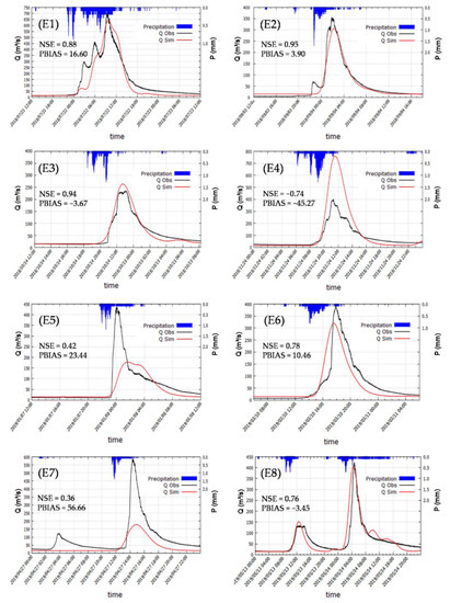 The performance of HEC-HMS in simulating the streamflow at one-minute time steps showed satisfactory results (Table 4 and Figure 4). In accordance with the Moriasi et al. [21] guidelines for calibrating hydrologic models, the NSE (0.88) and PBIAS (16.6%) for the calibration event (E1; Figure 4) indicated a good fit between the observed and simulated streamflow. Similarly, in four (E2, E3, E6, E8) of the seven validation events, the hydrologic model had a satisfactory performance (0.76 ≤ NSE ≤ 0.95; −3.67% ≤ PBIAS ≤ 10.46%; Figure 4). Since high performance metrics are difficult to achieve using a one-minute time step, and the Moriasi et al. [21] performance ratings are for monthly time-step evaluations, we considered that our model had also an acceptable performance in simulating event E5, which obtained a NSE of 0.42 and a PBIAS of 23.44% (Figure 4).