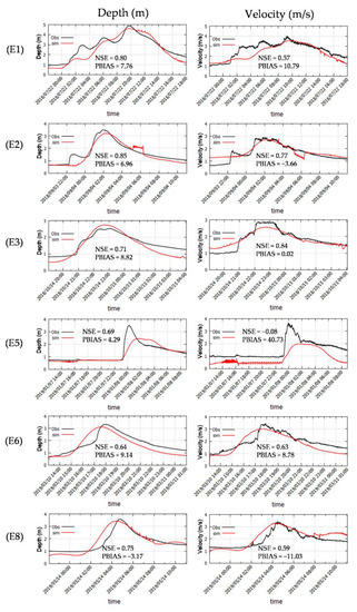 Observed (black line) and simulated (reddish line) water depth (m) and flow velocity (m/s) for the calibration and validation events (E1-E3, E5, E6, E8).