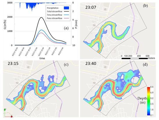 Spatio-temporal evolution of the flood event generated by the 500-year storm on 2 September 2017. (a) HEC-HMS-reconstructed hydrograph. Flood stage (b) at the beginning of the river overflow, (c) when the overflow took place along several river segments, and (d) at the time of peak flow.
