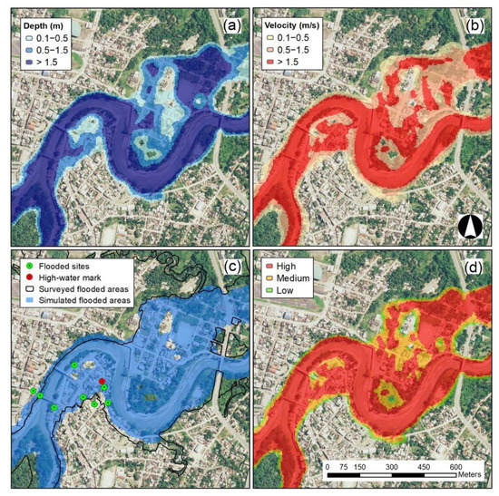 Reconstructed 500-year flood event. (a) water depths; (b) flow velocities; (c) simulated flood extent against surveyed flooded areas (black line) and control points of flooded sites (greenish dots), and location of the high-water mark (reddish dot); (d) flood intensity map as a function of flow velocity and water depth in compliance with Cançado et al. [75] guidelines (Table 3).