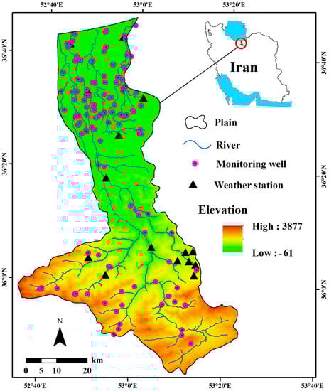 The study area is situated in the east of Mazandaran province, Iran, with an area of about 3297 square kilometers which expands from longitudes 52°36′ to 53°23′ E and latitudes from 35°44′ to 36°46′ N (Figure 1). The Ghaemshahr-Joibar plain is surrounded from the north with the Caspian Sea, from the east with the Siahrood River, from the west with the Thalar River, and from the south with the Alborz mountains. This plain is located in the Talar and Siahrood River Basins which reaches in the north to the Caspian Sea. Because of the Caspian Sea adjacent to this plain, the climate is categorized as Caspian mild with a minimum temperature of 6 °C in winter and the average maximum temperature of 25 °C in summer times [51]. The rainfall is about 700 mm in the southern and 850 mm in the northern part of the plain, in which the wet period of the year occurs in November and December. There are agricultural and cultivation activities in this plain with the predominant cultivation of rice; vegetables, colza, broad bean, and clover are the other crops that are commonly cultivated in winter months of the year [52]. Groundwater is among the main sources of water supply; more than half of drinking water demand is provided by groundwater resources such as springs and wells. The use of groundwater in the agricultural sector is the highest with 87.8%, then it is followed by drinking needs (11.4%), and the lowest percentage is for the industrial sector with 0.9% [53].