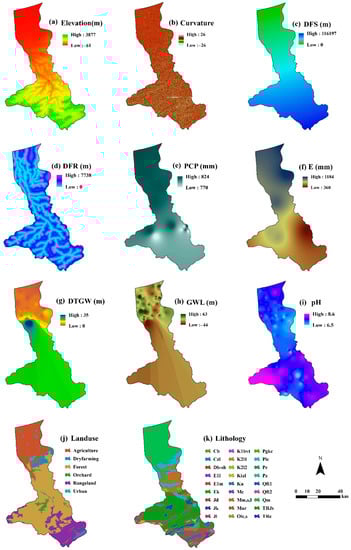 Environmental factors used for hardness susceptibility modeling: (a) elevation, (b) curvature, (c) distance from sea (DFS), (d) distance from river (DFR), (e) precipitation (PCP), (f) evaporation (E), (g) depth to groundwater (DTGW), (h) groundwater level (GWL), (i) pH, (j) landuse, and (k) lithology.