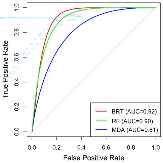 After ensuring the lack of the multicollinearity problems (Table 2) among the variables, the modeling process was conducted using the k-fold cross-validation methodology. The performance of the predictive models is presented in Table 3. As can be seen, the area under curve (AUC) values for all the models was more than 80% (Table 3, Figure 3). Accuracy values for the MDA and RF models were about 83% and were higher than the BRT model (Accuracy = 78%). Additionally, True Skill Statistic (TSS) values were equal to 0.73, 0.71, and 0.59, respectively, for RF, BRT, and MDA models (Table 3).