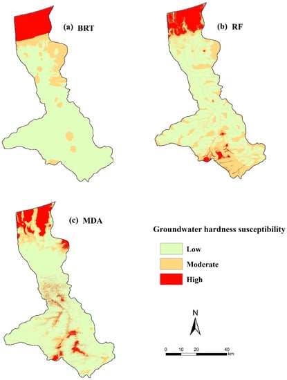 Using all the pixel values for the whole region, the groundwater hardness susceptibility maps were predicted and classified into three classes of low, moderate, and high based on the natural breaks’ classification methodology. Figure 4 indicates the predicted maps in which low classes had a higher area, respectively—2474.14, 1924.30, and 2403.51 km2 for BRT, RF, and MDA models. Additionally, moderate class locations were covered by about 443.34, 1022.22, and 518.07 km2 for the BRT, RF, and MDA models, respectively. The high hardness susceptibility class was equal to 379.21, 350.17, and 375.11 km2, respectively, for BRT, RF, and MDA models, which are mostly located in the south of the Ghaemshahr-Joibar plain (Figure 4, Table 4).
