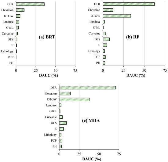 The importance of the variables was calculated using the decrease in AUC (DAUC) after removing each variable from the modeling process (Figure 5). Higher DAUC for a variable indicates the higher importance of that variable. As can be seen, variables of DFR, elevation, DTGW, and land use were identified as the most important inputs by the BRT model (respectively, with DAUC about 36%, 10%, 5%, and 4 %). Given the RF model, the variables of DFR, DTGW, elevation, and DFS (with the DAUC values of 62%, 34%, 12%, and 8%) had a higher contribution in the modeling process. Additionally, like the RF model, results of the MDA model demonstrated that the variables of DFR, DTGW, elevation, and DFS were the most important variables which had the DAUC values of 71%, 38%, 14%, and 9% (Figure 5).