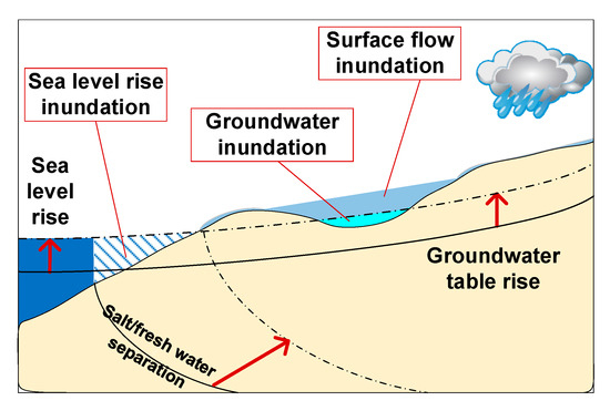Habel, Fletcher [25] described a modeling approach that simulates narrowing of the unsaturated space and groundwater inundation generated by SLR-induced lifting of coastal groundwater. The methodology combines terrain modeling, groundwater monitoring, estimation of tidal influence, and numerical groundwater-flow modeling to simulate future flood scenarios considering user-specified tide stages and magnitudes of SLR. They applied their method to the heavily urbanized and low-lying areas in Honolulu, Hawaii, USA. Results indicate that SLR of nearly 1 m generates groundwater inundation across 23% of the 13 km2 study area, threatening $5 billion of real estate and 48 km of roadway. Befus, Barnard [26] assessed the increasing threat of coastal groundwater hazards from SLR in California. They modeled a range of SLR scenarios to assess the responses of water tables across the diverse topography and climates of the California coast. This research presented that with 1 m of SLR, flooded areas are predicted to expand 50–130 m inland, and low-lying coastal communities around San Francisco Bay are at a high risk. They illustrated that topography is a controlling factor; long-term rising water tables will intercept low-elevation drainage features, allowing for groundwater discharge that damps the extent of shoaling in 70% of California’s coastal water tables. Davtalab, Mirchi [27] also assessed the effect of sea level rise on groundwater inundation and its consequences on the capacity of retention ponds near Tampa Bay, Florida, USA. They found out that groundwater level rise can significantly reduce the soil storage capacity and cause infiltration at retention ponds, which reduces the ponds’ capacity in capturing upcoming storms. Partial groundwater inundation can affect retention ponds’ ability to reduce peak flow rates and keep the post-development outflow lower than or equal to pre-development conditions. Apart from causing SLR, climate change can shift the pattern and frequency of precipitation, causing unprecedented surface flooding and inundation [28,29,30]. In coastal regions, if rainfall over inland areas coincides with higher sea levels (e.g., high tide), impacts of flooding could be exacerbated due to the diminished ability of terrestrial drainage. In sum, emerging inundation sources in coastal regions under a changing climate are (Figure 2): (i) surface flooding as a result of precipitation, (ii) SLR-driven marine inundation, and (iii) SLR-driven groundwater rise.