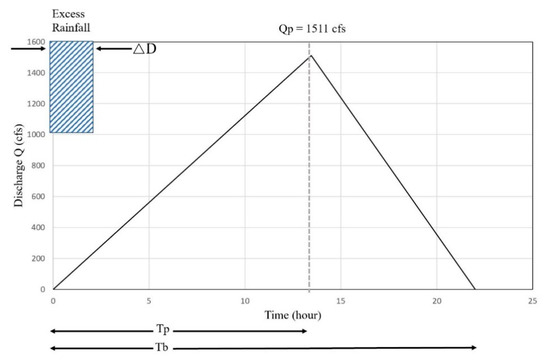where TL is lag time (h), l is flow length (ft), CN is curve number, Y is average watershed slope (%), Tp is time to peak (h), ΔD is duration of rainfall (h), Qp is peak discharge (cfs), A is area (mi2), and Tb is time to base (h). Figure 5 represents the flow hydrograph of the catchment developed by applying SCS triangular hydrograph method. The duration of rainfall, and CN are considered as 24 h and 0.85, respectively. Excess rainfall is the rainfall that directly contributes to the surface runoff. It is calculated by subtracting the losses and/or abstractions from the total rainfall.
