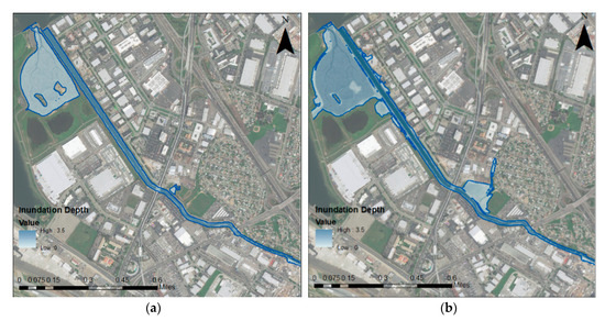 (a) Blue area shows compound impacts of high tide (1.94 m) and 2 year precipitation, (b) shows compound impacts of high tide, 1 m SLR, and a 2-year precipitation.
