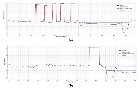 In order to better represent the water elevation in different scenarios, two cross sections with significant inundation projections are selected to be analyzed. These two cross sections are identified in Figure 8. Figure 9 represents the side view of water elevation in these two cross sections. According to this figure, compound effects can cause a flooding depth of over 0.5 m in the built infrastructure, which may cause safety issues, especially for the transportation infrastructure.