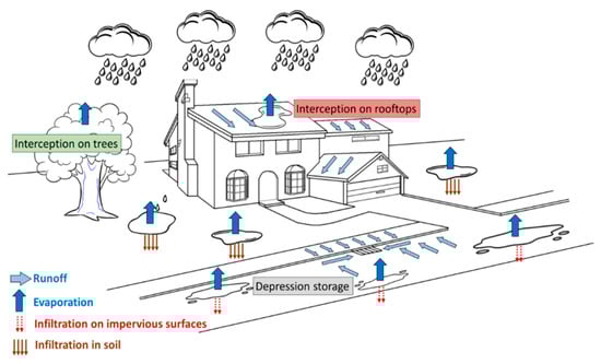 Rainwater retention occurs on the whole urban catchment with varying degrees of magnitude depending on the macro- and micro-morphological characteristics of the retaining surface. The retained volume is then drained by infiltration and/or evaporation. Based on the processes acting on this volume, a distinction could be made between two kinds of retention: rainfall interception where water is exposed only to evaporation, and depression storage where water is exposed to both evaporation and infiltration (Figure 1).