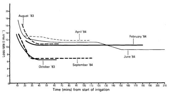Temporal variation of the infiltration rate of paved areas during an irrigation experiment (Extract from [47]).