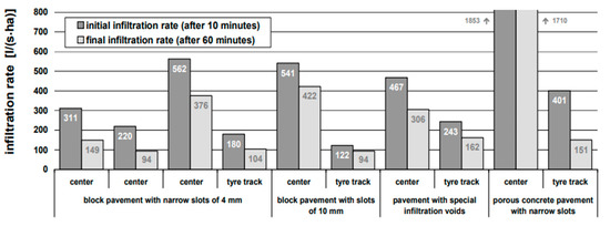 - Pavement age: Some researchers were interested in studying the impact of a pavement age on its infiltration capacity. Contrasting results were obtained according to the pavement type. Based on in-situ measurements of infiltration on a classical cement pavement in Brussels over a 1 month period (November), Van Ganse (1978), cited in [60], noticed a clear increase in the pavement permeability with ageing. A slight degradation of the pavement state could increase the infiltrated volume of rainfall from 5% (rate observed for a new pavement) to almost 50%. Another observation made in [59] noticed a decrease by one to three orders of magnitude of the pavement permeability with increasing degradation. However, an inverse effect of ageing on pavement infiltration capacity was obtained when in-situ measurements were carried out on porous paving blocks and permeable interlocking concrete pavement [64]. Results of the field tests show a clear decrease in the long-term infiltration performance with age interpreted by the entrainment of mineral and organic fines responsible for the clogging of joints and pores of porous paving blocks. This recession was found to reach its asymptotic capacity after 8–12 years of the construction of these types of pavements.