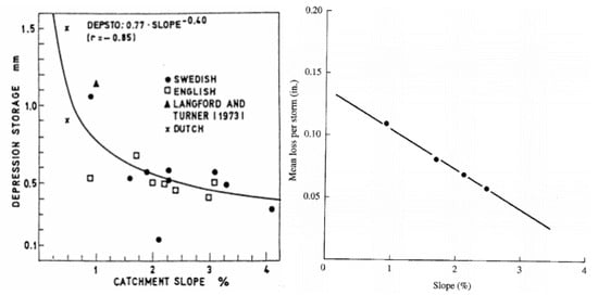 Relationship between depression storage and the catchment slope established by: (left) [71], (right) [28].