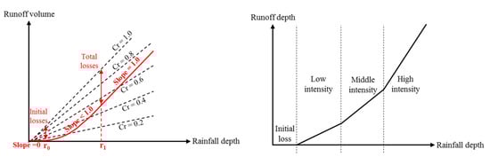 Theoretical plot of rainfall-runoff as: (left) exponential model showing losses and runoff coefficient values (Cr) [79], (right) three continuous linear models [81].
