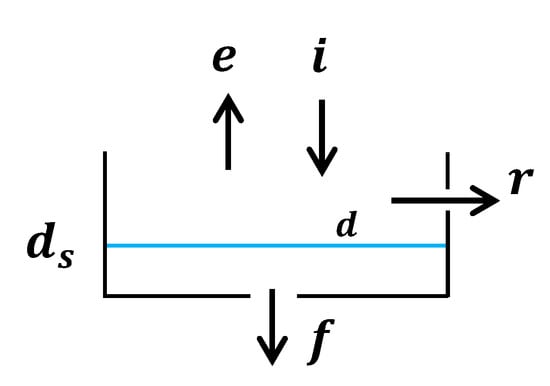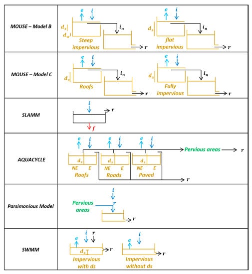 Unlike the global approach based on the empirical relationship between urban runoff and rainfall, the detailed approach is more physically based. Almost all detailed approaches developed in the literature are based on the reservoir concept where the reservoir constitutes the central element of the model structure (Figure 7). The runoff rate is determined by applying the mass balance equation between the input rainfall and the output from the continuous losses due to infiltration and evaporation. Initial losses are commonly represented by a storage volume beyond which ponded water starts to generate runoff flow. So, when retained volume exceeds the reservoir storage capacity, runoff is determined by solving the differential equation (Equation (5)) using any numerical scheme (Euler, Runge–Kutta of any order…).