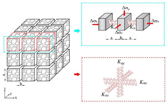 Fractured rocks can be generalized into a matchstick model consisting of a network of fractures and complete rock blocks [27,38], as shown in Figure 3. Under the assumption of elasticity, the volume strain of a fractured rock is composed of two parts: the joint and the intact rock mass. The stiffness of the joint is much lower than that of the matrix and will cause great deformation, even under a small load. Therefore, in engineering, an engineering strain is often used to describe a small deformation of the matrix, while a natural strain is used to describe a large deformation of the joint [39]. Thus, a complete rock can be simplified into a combination spring parallel to the three loading directions, and fractured rocks can be simplified into a combination of a filled body and a spring perpendicular to the joint plane.