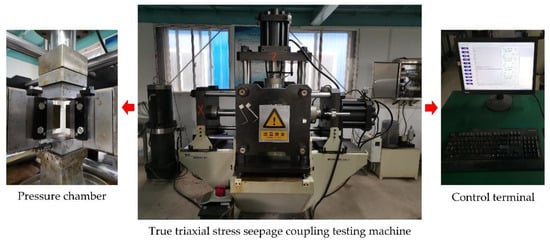 The test system consisted of five parts: the main engine, the infiltration water cylinder, the hydraulic source, the infiltration pressure system, and the electronic control system. The instrument is shown in Figure 4. Compared to the advanced rock mass triaxial seepage test devices used in current scientific research work, this test system can be independently loaded in three directions to achieve the permeability characteristics of the rock under a true triaxial stress state research (including seepage deformation and seepage failure). The system can apply static pressure in the range of 0~1000 KN, which is provided by a hydraulic source. The pressure measurement accuracy is 0.1 MPa, and the displacement measurement accuracy is 0.01 mm. At the same time, the seepage pressure system is a key component of the measurement system. A water tank with a maximum water storage volume of 20 L provides a seepage pressure of 0–30 MPa. During the test, confining pressure and seepage pressure were applied simultaneously. The application of seepage pressure resulted in the formation of seepage pressure difference at both ends of the specimen, allowing pore water to flow out from the bottom of the specimen. The real-time seepage flow data of the rock specimen were obtained by weighing with a high precision electronic balance and transmitted to the host, which generated digital maps of the data.