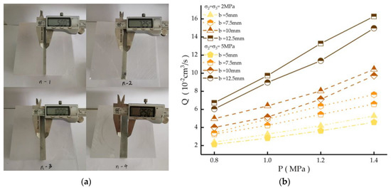 To explore the influence of the fracture aperture on the seepage discharge Q, test steps 1 and 2 were carried out. The specimens with four different fracture apertures are shown in Figure 6a. Under the conditions of low and high confining pressure, the seepage discharge of the specimens varied with the seepage pressure, as shown in Figure 6b.