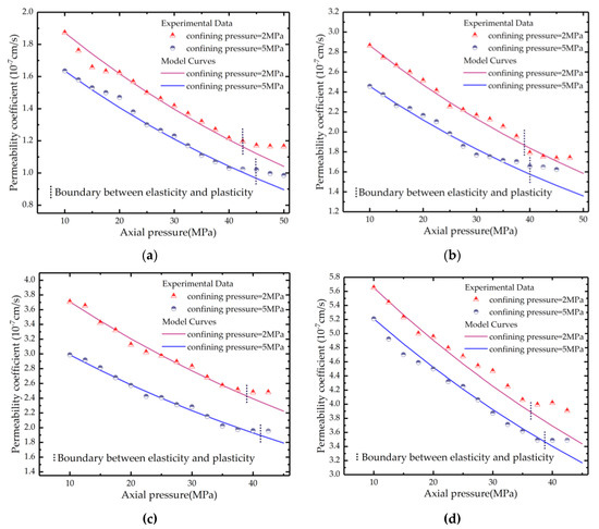 Analyzing the verification of the constitutive model, it can be seen that within the range of elasticity, the calculation results of the model and the test results are in good agreement. The correlation coefficient was then used to describe the fitting degree of the model. We calculated that the correlation coefficients of the experimental results and theoretical calculation values under various conditions were both greater than 0.95. This shows that under the condition of online elasticity, the permeability model established in this paper can reflect the change trend of the permeability characteristics of the fractured rocks. Notably, under high stress conditions (σ1 > 50 MPa), the fitting results begin to deviate because the filling fracture plate enters the plastic phase from the elastic stage. In the plastic phase, the aperture of the filling fracture is further reduced, but at the same time, the internal cracks are gradually penetrated, and new seepage channels are gradually formed between the fracture fillings. This channel leads to an increase in permeability. Under the combined action of the above two influencing factors, the sample shows the characteristics of a stable permeability coefficient.