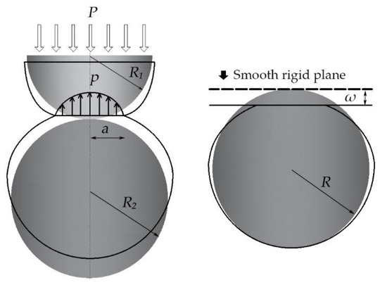 Using the same assumption as Hertzian contact theory [48], the contact between the spheres is considered frictionless contact, and the contact area is an elastic space; then, the contact interference ω and indentation radius a can be calculated by the pressure P, as follows: