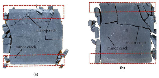 After the destructive loading test, shear failure occurred in the filling cement plates of two samples, a large number of through cracks appeared, and the structure lost its integrity. To distinguish the sizes of the cracks, cracks with a maximum opening greater than 0.5 mm were called large cracks and could be directly observed by the naked eye. Cracks with maximum openings of less than 0.5 mm were called small cracks and could be observed by microscope. Red dotted lines were marked on the upper and lower sides of the two filling plates. Due to the stress concentration, the cracks were most densely distributed on the upper and lower surfaces. It can be seen from the test results that the distribution frequency of major cracks and minor cracks in the upper part of the two samples filled with cement board was greater than that of the lower part, and, by observing the propagation morphology of the major cracks, the splitting effect was obvious. At the same time, transverse cracks were observable in the filling material, which indicated that the extrusion of the rock matrix was an important factor affecting the failure of the filling fracture. This shows that the filling part was affected by the seepage pressure and produced a radial stress component that greatly accelerated crack propagation and made the seepage channel run through from top to bottom. This shows that water pressure can promote crack development, which verifies the theory proposed in the previous section.