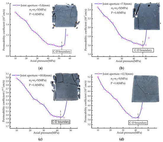 Effect of the maximum principal stress loading failure process on the permeability changes in the specimens with infilled fractures: (a) fracture aperture of 5 mm; (b) fracture aperture of 7.5 mm; (c) fracture aperture of 10 mm; (d) fracture aperture of 12.5 mm.