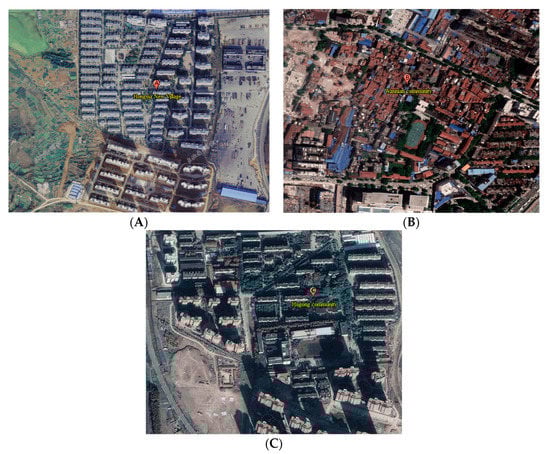 Map of the study area (A): Hongxia community; (B): Wannian community; (C): Hugong community.