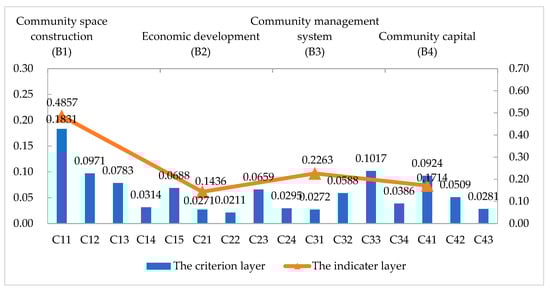 The initial indicator weights were calculated by Yaahp, based on the AHP method (Figure 6). Yaahp is an analytic hierarchy process auxiliary software that provides assistance in model construction, calculation, and analysis in the decision-making process, using an analytic hierarchy process. The weight of community space construction dimension was 0.4586, which is nearly half of the sum of all dimensions. The calculation results show that the weight deviation of the calculated indicators was large, which lacks objectivity and reliability. Therefore, the weight value obtained by the experts must be optimized to improve the poor effectiveness and practicability of the index weight value caused by the strong subjective arbitrariness of expert weight scoring.