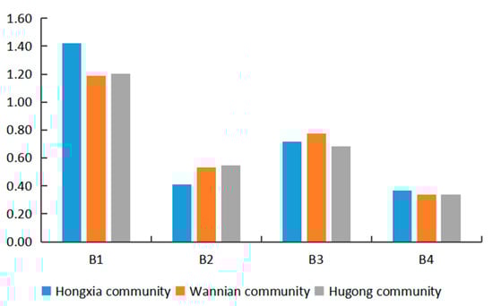 After the above optimization weights were calculated, the resilience indexes of the three communities could be obtained by linear weighting of the values and the collected data. Finally, the total averaged score was calculated, with 2.91 in the urban village, 2.83 in the commercial housing in the old city, and 2.77 in the apartments, respectively. Figure 7 shows that Hongxia community had the best resilience in the community space construction (B1) dimension, since it is a new community, where the community space construction is relatively comprehensive. However, this area was not resilient to the economic development (B2) dimension due to its remote location. Wannian community is located in the center of the city, so it has quite comprehensive community management systems, and abundant resources, which allow a quick response in the event of disasters. These three communities, in which the sense of belonging of the transient population is still weak, suffer poor resilience in terms of the community capital (B4). The priority of community resilience is shown: Hongxia community has the highest level, followed by Wannian community, and the Hugong community is relatively weak at coping with serious disasters.