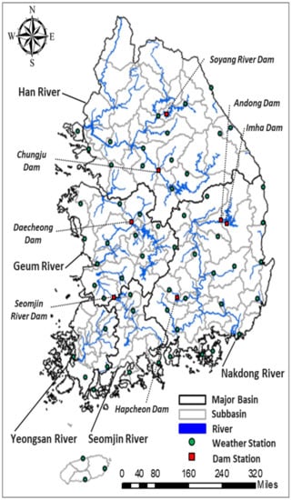 The study area is South Korea, which consists of five major river basins (Han River, Nakdong River, Geum River, Seomjin River and Yeongsan River basins). The locations of the five river basins, six multipurpose dams and 59 weather stations used in this study are presented in Figure 1. The Han River basin is the largest basin with an area of approximately 35,770 km2, and the Nakdong River basin is recognized as the longest river basin with a total length of 525 km. The climate of South Korea is dominated by various geographic and extreme seasonal weather conditions. The seasonal climate of South Korea is affected by the monsoon in summer and Siberian cold weather in winter []. The wet season in South Korea constitutes approximately 67% of the annual precipitation from July to September, which causes an increase in the vulnerability to drought during the dry season from October to March []. The data periods of observed meteorological and hydrological data were from 1981 to 2016, and those data were collected from the Korea Meteorological Administration (KMA) and Ministry of Land, Infrastructure and Transportation (MOLIT). Additionally, the forecasted meteorological data of the GloSea5 were obtained from the KMA. The hindcast data period of GloSea5 is 1996–2009, and the forecast data period for the case study is 2015 and 2016.