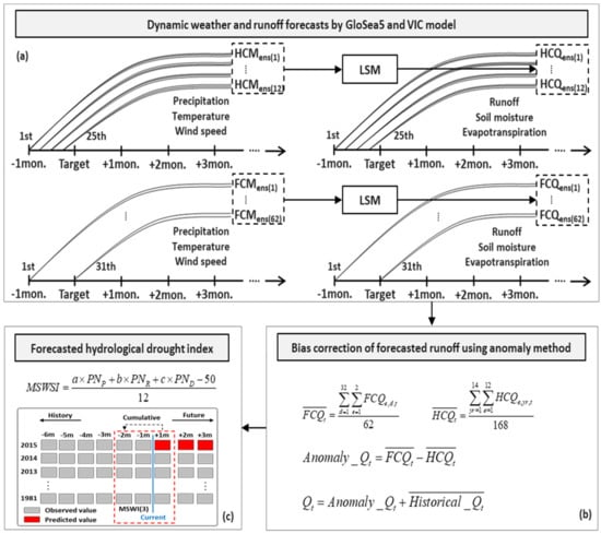 Outline of the hydrological drought forecasting framework. (a) procedure for the dynamic weather and runoff forecasts by GloSea5 and VIC model; (b) procedure for the bias correction of forecasted runoff using anomaly method; (c) procedure for the forecasted hydrological drought index.