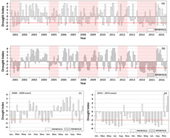 MSWSI results for 1-month and 3-month data periods; (a) time-series of MSWSI(1) during 2001–2016 year; (b) time-series of MSWSI(3) during 2001–2016 year; (c) MSWSI(1) and MSWSI(3) of 2008–2009 drought events; (d) MSWSI(1) and MSWSI(3) of 2014-2015 drought events.