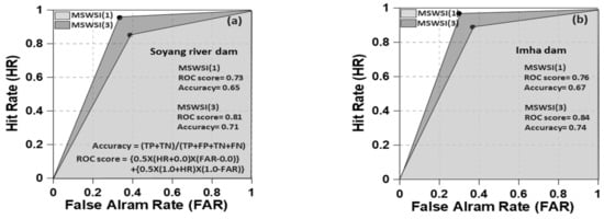 Receiver operating characteristic (ROC) diagrams of MSWSI(1) and MSWSI(3) for two dam basins. Results of ROC analysis for the Soyang river dam (a) and Imha dam (b).