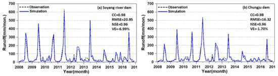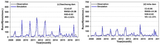 In this study, the VIC model was constructed with a spatial resolution of 1/8° (approximately 12.5 km) over South Korea. The topographic and historical observed meteorological data (e.g., precipitation, maximum and minimum temperature and average wind speed) were adjusted to the gridded data for this resolution, and the daily runoffs were simulated for the period of January 1, 1981–December 31, 2016. The data period of 1981–2007 was used for model calibration and that of 2008–2016 was used for model verification. Figure 5 shows the time series of observed and simulated runoffs for the verification period for the selected subbasins in this study area. As shown in the figure, the simulated runoffs agree well with the observed runoffs. CC, RMSE, NSE and VE in the figure represent the correlation coefficient, root mean square error, Nash–Sutcliffe efficiency and volume error, respectively, and those statistical values are calculated from Table 3.
