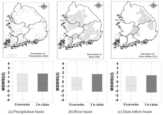 Graphical and statistical analyses were performed to evaluate the performance of MSWSI(3) for the drought period of 2015–2016 (hereafter the 2015-2016 drought) when the simulated and observed runoffs were used. The upper panel of Figure 6 shows the classification of the subbasin depending on the dominant variables in (5) with 60 precipitation basins, 40 river basins and 17 dam basins. The precipitation basins are affected by precipitation only, while the river and dam basins are affected by runoff and dam inflows in addition to precipitation, respectively. The lower panel of Figure 6 represents the values of MSWSI(3) obtained from both observed and simulated data for the three different basin types. The CC and RMSE values of the precipitation subbasin are 1.0 and 0.0, respectively, because the precipitation subbasins require only precipitation data. Moreover, it can be seen that the values of MSWSI(3) obtained by using simulated runoffs agree well with those of observed runoffs for runoff basins and dam basins. The CCs of those values ranged from 0.81–0.90, and the RMSEs ranged from 0.97–1.33. Therefore, it is concluded that the values of MSWSI(3) obtained from simulated runoff are expected to be suitable for hydrological drought prediction.