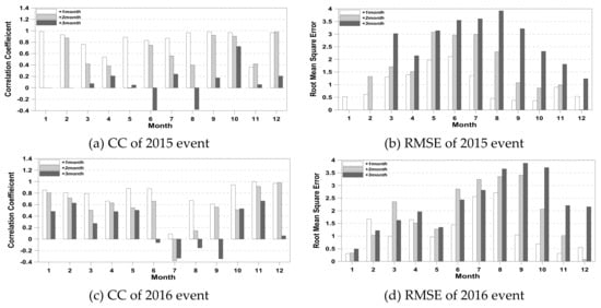 Figure 7 represents the results of the statistical analysis for each month of the 2015-2016 drought period, which was recorded as one of the most severe droughts in South Korea. The CC and RMSE of MSWSI(3) between the observed and forecasted values for 1-month, 2-month and 3-month forecast lead times are computed in this study.