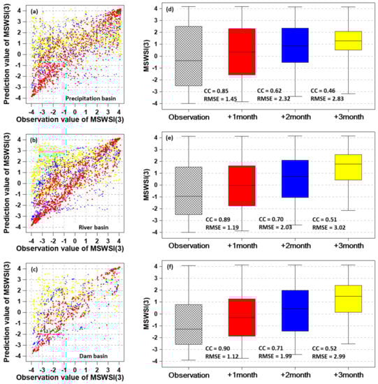 Figure 8 shows the CC and RMSE values for MSWSI(3) between the observed and forecasted data depending on three different subbasin categories for the 2015–2016 drought event. As indicated in Figure 8 (refer to the left panel), the predictabilities of MSWSI(3) that represent the difference between observed and forecasted values were higher when shorter lead times were used.
