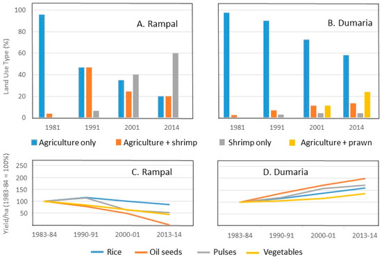 The above examples represent the concurrent culture of aquaculture species and cultivation of rice on the same land/water footprint, but it is also possible to grow rice in seasonal rotations with aquaculture. Fish can be farmed during the season when rice is not cultivated or substituted for a crop that would otherwise be cultivated in rotation with rice. Such rotations are common in some provinces of China as well as parts of India, Bangladesh, and other countries [89,161,164,166,167]. Analogous prawn–rice and prawn–fish–rice rotations are of widespread occurrence in Bangladesh [36,168], where shrimp–rice rotations are also practiced (see Section 2.2). In Java, six different variations of rice–fish are practiced, depending on local edaphic and environmental conditions [169].