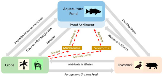 One of the most self-contained and highly developed forms of IAA is jitang, which is an ancient Chinese mulberry–dike fish–pond system [181,182,183]. Jitang has been practiced for millennia, especially in the Pearl River delta, where it has largely supplanted fishing and the traditional cultivation of crops [184,185,186]. Over time and in response to the flood-prone nature of their environment, farmers learned to excavate soil to create ponds and use it to construct a network of raised dikes to control water flow and permit the cultivation of crops. The jitang form of IAA is characterized by the tight coupling of aquaculture, which relies on carp polycultures for efficiency, and agriculture, which is unusually flexible and accommodates both annual and perennial species [182]. Jitang is distinguished by the cultivation of mulberries, which supports a local silkworm industry that generates residues reusable as nutrient inputs; similar benefits are provided by mushroom cultivation, which utilizes nutrients from pond sediments and contributes wastes that serve as fertilizer for crops (Figure 3, dashed red lines). Although complex and continuously evolving as social and economic systems change, the jitang form of IAA is little known outside of Asia and in need of analysis from a broad perspective [182,187].