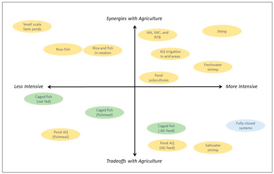 Quadrant analysis of synergies and tradeoffs between agriculture and various forms of aquaculture (y-axis) verses intensiveness of the aquaculture practices (x-axis). Aquaculture categories are color-coded as open (green), partially closed (orange), and closed (blue). Abbreviations are: AG, agriculture; AQ, aquaculture; IAA, integrated agriculture–aquaculture; VAC, Vietnamese garden–pond–livestock; RTB, roots–tubers–bananas.