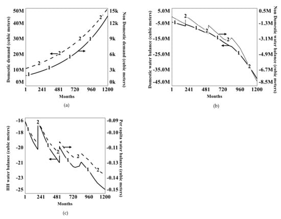 Figure 2a demonstrates the total water demand growth, including domestic (DD) and non-domestic (DND) demand categories for the city of Hyderabad. Within the 1.94% population growth rate, domestic water demand outgrew non-domestic water demand in 10 years (t = 120) with a total monthly demand value of 7.95 million cubic meters by December 2017 (t = 120). Additionally, the non-domestic water demand with a growth rate of 1.5% grew up to 6.24 thousand cubic meters per month (Month 120). Further simulations up to 2107 under current population growth rate and non-domestic demand growth rate and domestic water demand indicates a major proportion of the total urban water demand.
