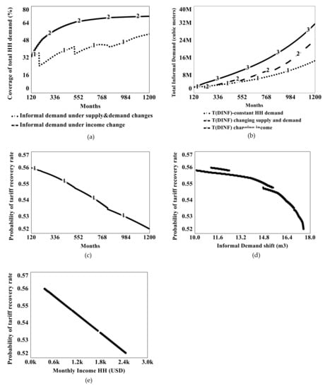 (a) Informal water demand at HH level under supply demand gap and income change (b) Total informal demand (million cubic meters)at city level under current infrastructure capacity, population increase and income change (c) Probability of HH’s tariff recovery rate over simulation period; (d) probability of tariff recovery against informal demand; (e) against income change.