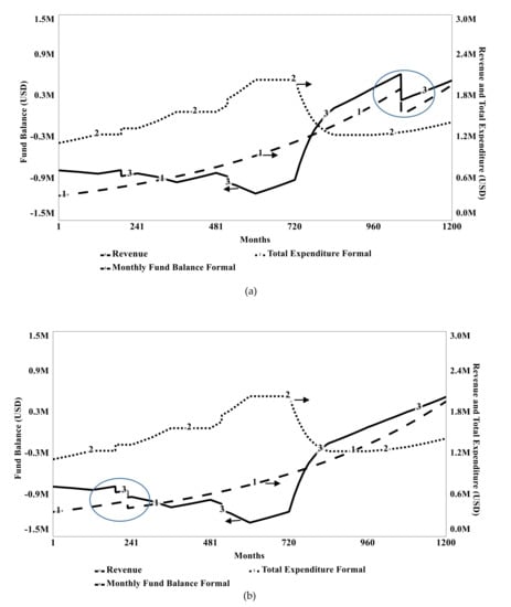 Formal system’s fund balance, revenue and total expenditure (Million USD) under (a) informal demand shift resulting from demand supply gap and (b) informal demand shift due to HH income change. Circled areas present the decline in revenue due to change in recovery rate.