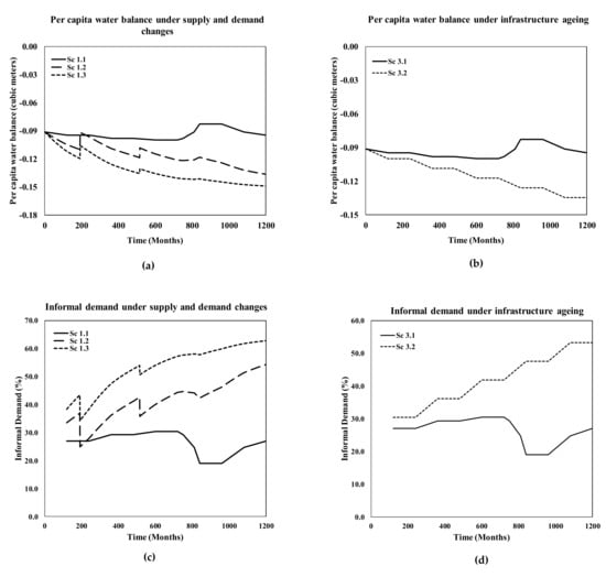 Sensitivity analysis of the per capita formal water balance (as shown in Figure 5a,b) reveals the variable to be more sensitive to supply and demand changes and infrastructure condition. The per capita formal water balance ranged from −0.095 to −0.0151 with the lowest value observed under the highest demand growth scenarios for domestic and non-domestic sectors, and no infrastructure rehabilitation scenario (Sc 1.3), which allowed water losses to reach up to 70% of total supply. A higher water balance value was observed under no changes in demand and supply scenario, with infrastructure rehabilitation (Sc 1.1), which allowed the water losses to be minimized after 100 years of infrastructure age.